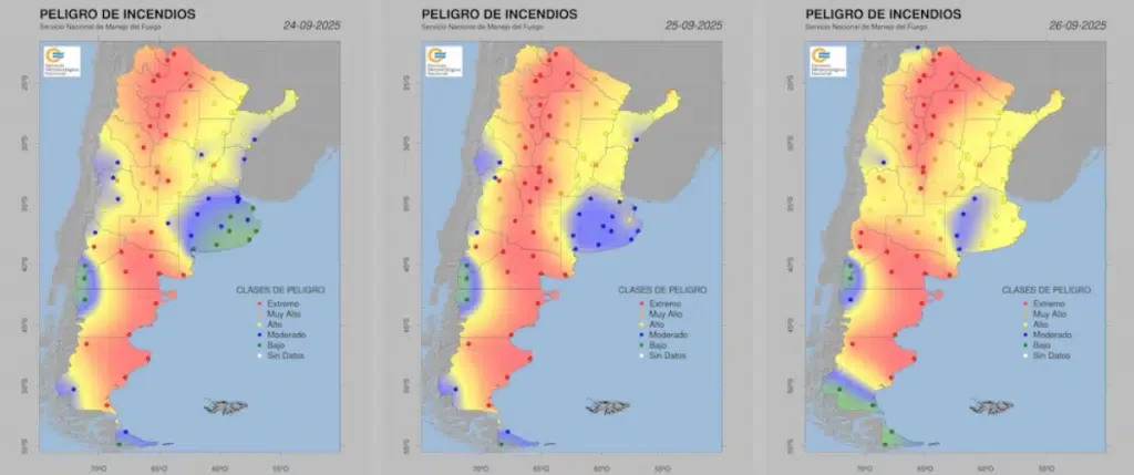 El Servicio Nacional de Manejo del Fuego (SNMF) emitió una alerta por riesgo de incendios forestales que abarca a Catamarca, Córdoba, San Luis, La Rioja, Salta, Jujuy, Santiago del Estero, Tucumán, Mendoza, San Juan, La Pampa y parte de la provincia de Buenos Aires. Además, se detectaron focos de riesgo extremo en sectores de Río Negro y Chubut.