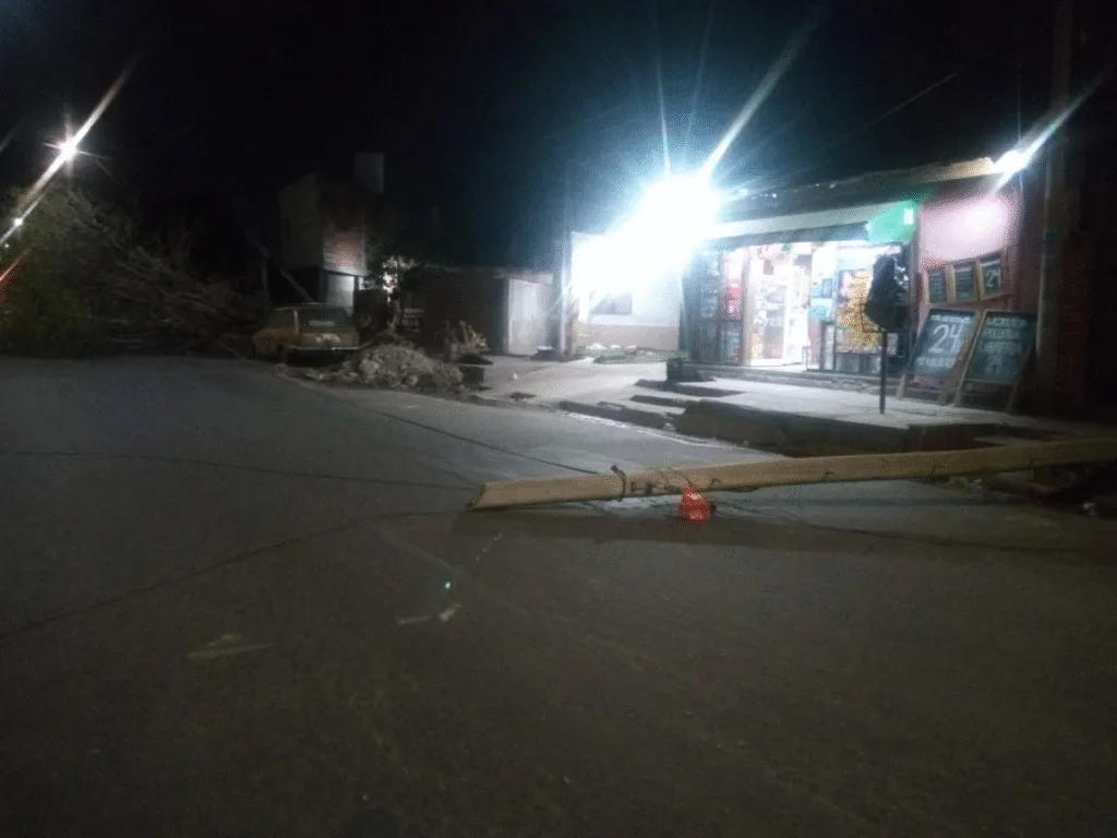 Uno de los tantos reportes señalaban que alrededor de las 21:30 horas de anoche en avenidas Mariano Moreno y Juan Pablo Vera, dos columnas del tendido eléctrico se desplomaron y un árbol se precipitó sobre un automóvil Renault 12 Break. El cableado cayó sobre una motocicleta en la que se trasladaba una mujer y un niño, provocando un derrape. El menor no sufrió lesiones pero la ella quedó tendida en la arteria con intensos dolores.