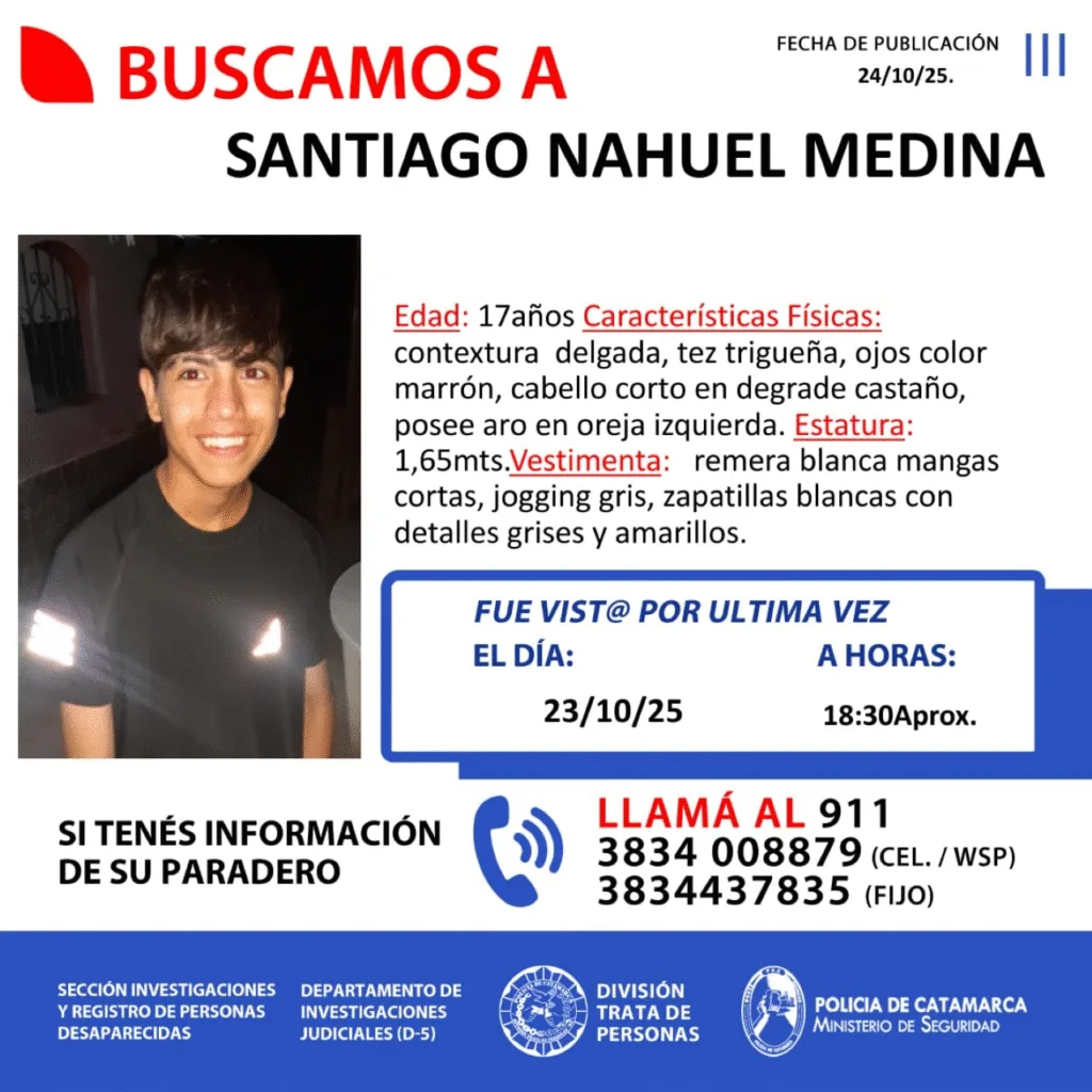 La Policía de la Provincia de Catamarca emitió esta mañana de viernes, un comunicado informando sobre la búsqueda de Santiago Nahuel Medina.