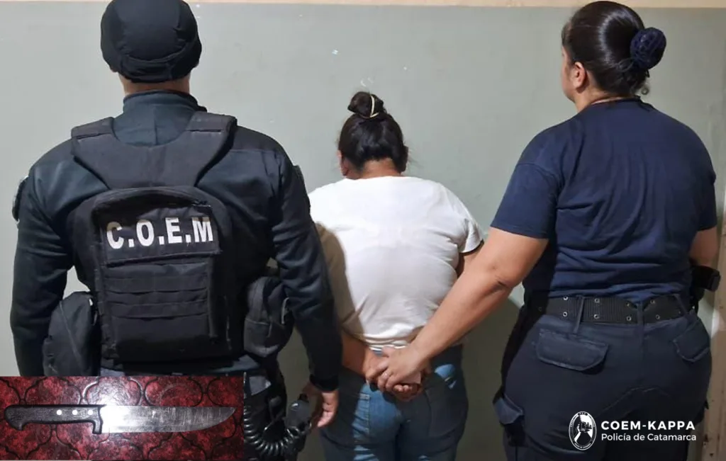 Una mujer fue aprehendida y una cuchilla incautada. Hoy, a las 03:15, por requerimiento del SAE-911, efectivos de la Comisaría Sexta se constituyeron en el pasaje Mejor Hogar, a la altura de la Peatonal N° 17, del barrio Libertador II, donde sus pares del COEM-Kappa tenían aprehendida a una mujer de apellido Benavidez (40), debido a que habría intentado agredir a su pareja de 49 años de edad, utilizando una cuchilla, que quedó en calidad de secuestro, como así también amenazó de muerte con el arma blanca a un vecino de 25 años.