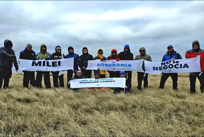 En otra imagen se ve a unos 12 integrantes del centro platense con consignas críticas al presidente Javier Milei y la leyenda “No al acuerdo Mondino-Lammy”, en relación al acta firmada en 2024 por la entonces canciller Diana Mondino y su par británico, David Lammy, para avanzar en políticas de acercamiento en materia de vuelos y cuestiones humanitarias.