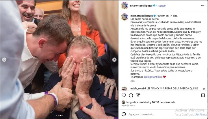 “Aguantando los golpes hasta de gente de la que menos lo esperábamos y aún así no respondiste. Dejaste que tu trabajo y tu dedicación sea lo que hable por vos, y anoche quedó demostrado con la mayoría del apoyo de los bonaerenses”, continuó Nicanor en la publicación que acompañó de videos y fotos celebrando junto a su padre.