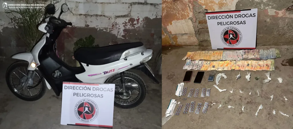 Tras irrumpir en las viviendas, los policías secuestraron envoltorios de plástico con sustancias tipo polvo blanco y herbácea, que al ser sometidos a la prueba de campo correspondiente, arrojó como resultado que se tratarían de cocaína y marihuana respectivamente, como así también incautaron cien (100) comprimidos de Midazolam de 15 ml., una (01) balanza de precisión, dos (02) teléfonos celulares de diferentes marcas y modelos, una (01) motocicleta Motomel Blitz blanca y la suma de cuatrocientos setenta y tres mil setecientos cincuenta pesos ($473.750) en efectivo.