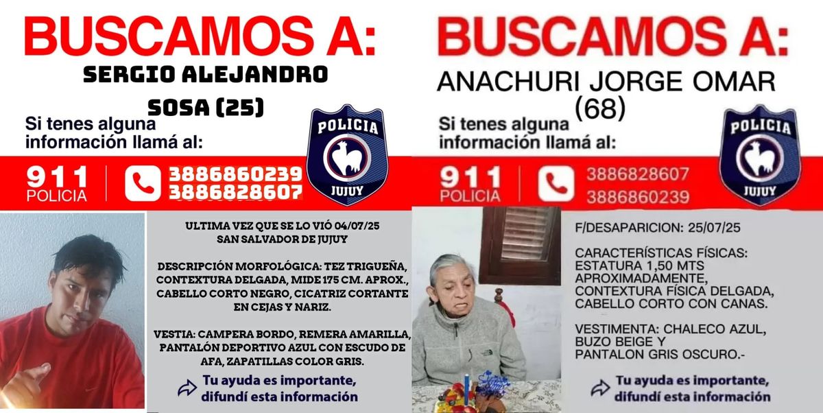 Los mismos, se corresponden a Jorge Anachuri de 68 años, denunciado como desaparecido el día 25 de julio y Sergio Alejandro Sosa de 25 años, cuya denuncia se realizó el día 8 de julio, ambos del presente año.