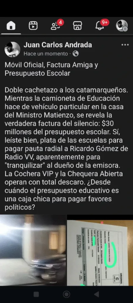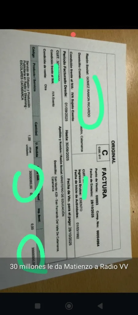 “En atención a la falaz, engañosa, distorsionada y falsa información difundida en redes sociales sobre supuesta facturación de esta emisora al Ministerio de Educación de la Provincia -que ya ha sido desmentida por dicho organismo oficial -, y atento a que dicha “fake news o noticia falsa” fue efectuada con evidente mala intención y que el perjuicio ocasionado por la difusión de la misma afecta el prestigio de todos quienes hacemos “Radio-TV Valle Viejo”, es que se ha instruido para que se inicien las acciones legales contra el autor/autores -uno de ellos claramente identificado en Facebook como Juan Carlos Andrada-, que propiciaron dicha maniobra en razón de los daños y perjuicios causados por ella”.