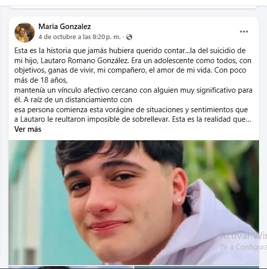 Tomado de Redes: “Esta es la historia que jamás hubiera querido contar… la del suicidio de mi hijo, Lautaro”